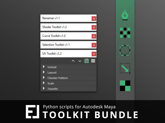 Save 20% with this bundle. The package includes the "UV Toolkit v1.2", "Selection Toolkit v1.1", "Curve Toolkit v1.0", "Shader Toolkit v1.2", "Renamer v1.2" and a custom Maya shelf with tool icons for easy access within Maya.