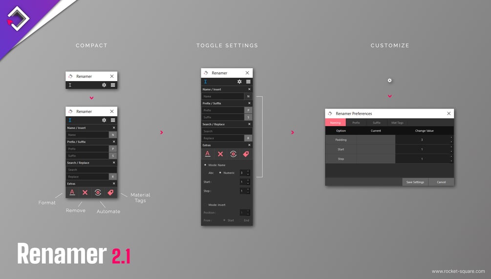 Compact Renamer for Autodesk Maya that offers advanced Naming, Insert, Prefix, Suffix and Search / Replace functions with an option to customize the naming convention. Extras to format or remove characters, tag materials and automated processes for a faster workflow. Additional Minimalist Mode that offers a minimal workspace footprint.